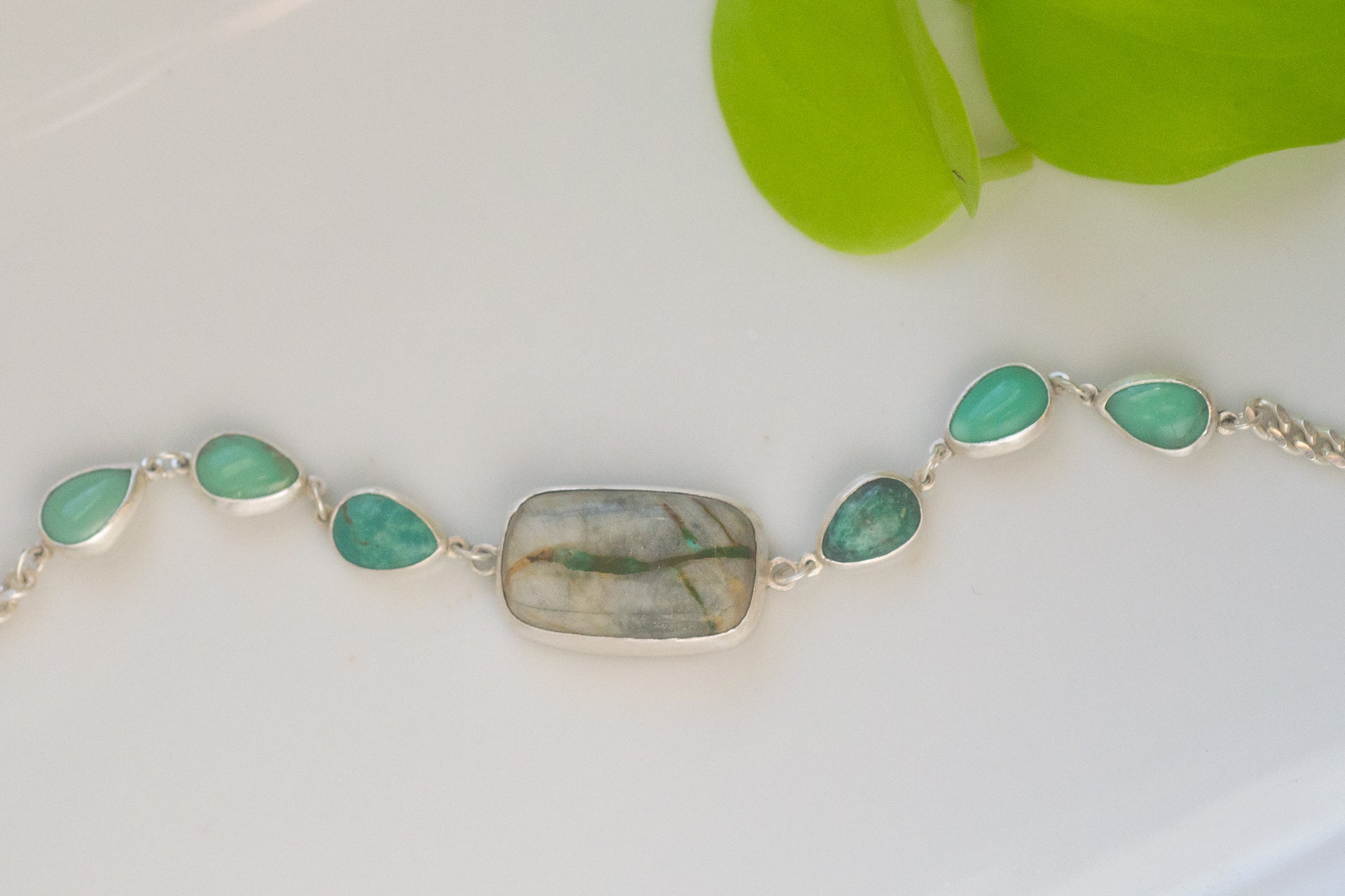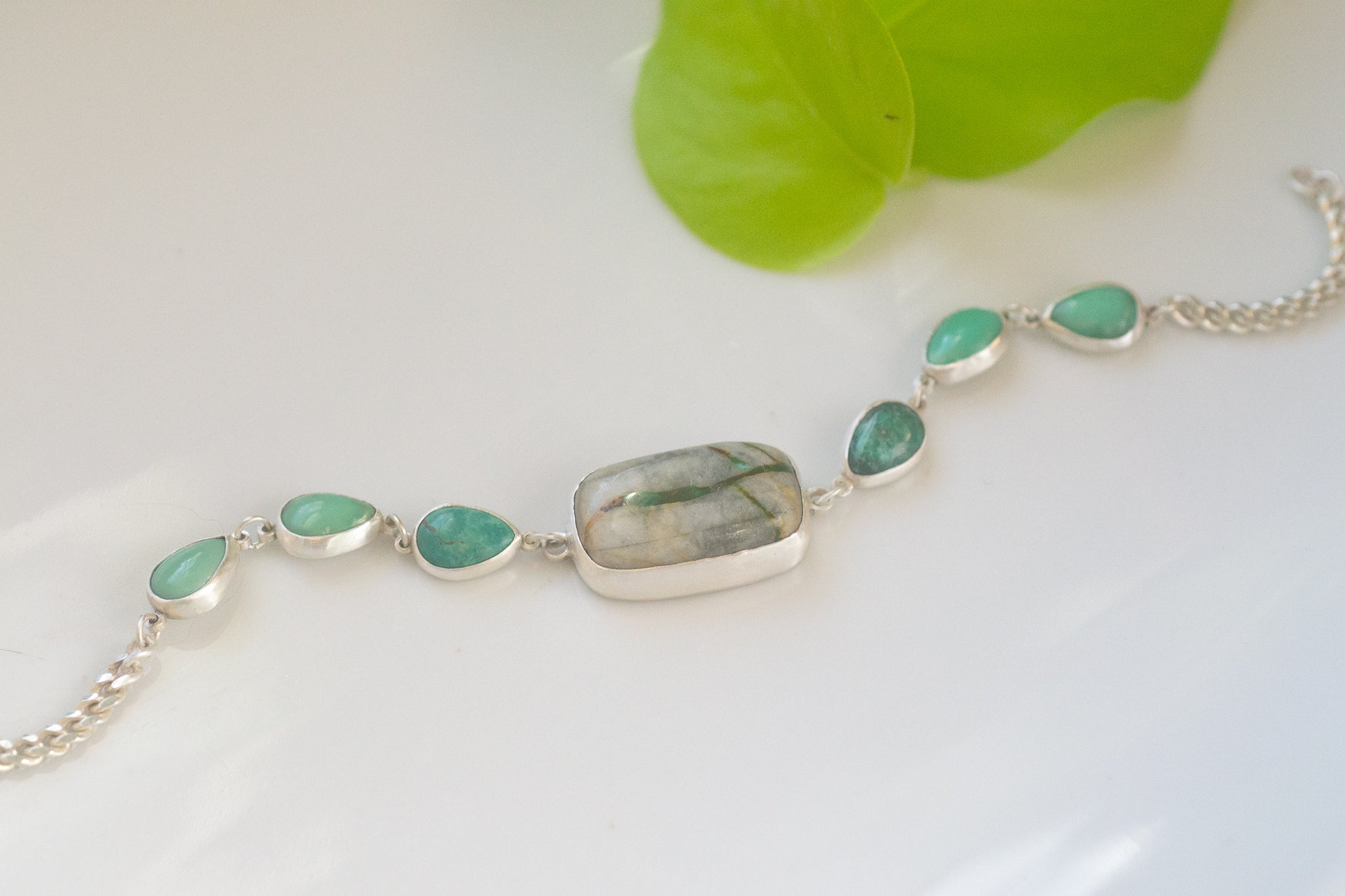 6 New Lander variscite arranged in an ombre gradient, 3 on each side of the Royston turquoise